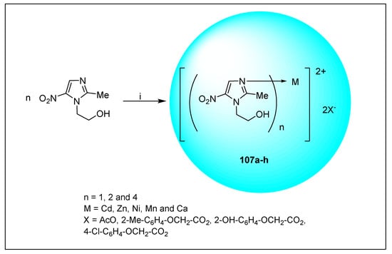 - Adamovich, S.N.; Ushakov, I.A.; Mirskova, A.N.; Mirskov, R.G.; Voronov, V.K. Novel complexes of 1-(2-hydroxyethyl)-2-methyl-5-nitroimidazole with metal acetates and arylchalcogenylacetates. Mendeleev Commun. 2014, 24, 293–294. [Google Scholar] [CrossRef]