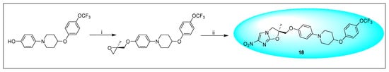 - Baker, W.R.; Shaopei, C.; Keeler, E.L. Nitro-[2,1-b]imidazopyran Compounds and Antibacterial Uses Thereof. U.S. Patent US6,087,358, 11 July 2000. [Google Scholar]