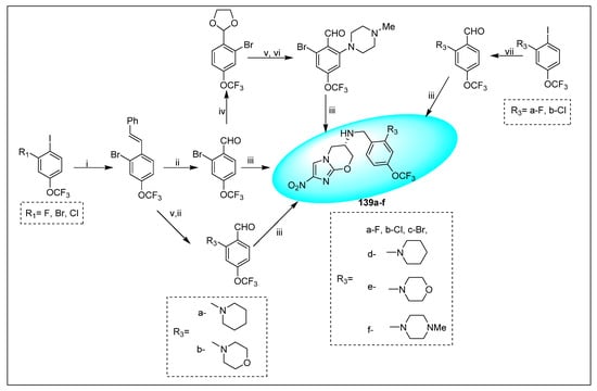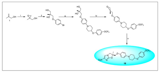 - Cherian, C.; Choi, I.; Nayyar, A.; Manjunatha, U.H.; Mukherjee, T.; Lee, Y.S.; Boshoff, H.I.; Singh, R.; Ha, Y.H.; Goodwin, M.; et al. Structure-activity relationships of antitubercular nitroimidazoles. 3. Exploration of the linker and lipophilic tail of ((s)-2-nitro-6,7-dihydro-5H-imidazo[2,1-b][1,3]oxazin-6-yl)-(4-trifluoromethoxybenzyl)amine (6-amino PA-824). J. Med. Chem. 2011, 54, 5639–5659. [Google Scholar] [CrossRef] [PubMed]
