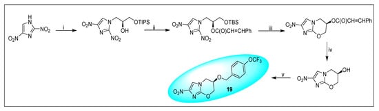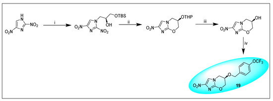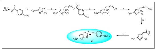 - Rao, D.R.; Malhotra, G.; Pullela, V.S.; Patil, S.L.; Rajeshirke, R.R. Process for the Preparation of Nitroimidazole Compounds, Especially the Tuberculostatic Pretomanid. IN Patent IN201621026053, 2 February 2018. [Google Scholar]