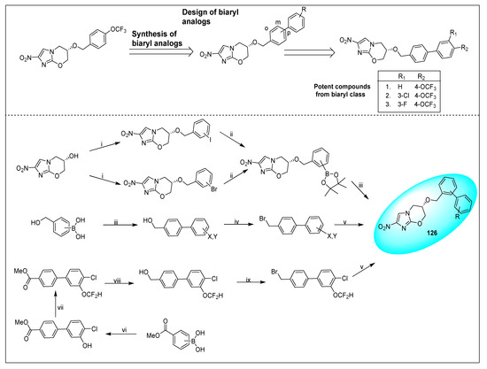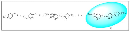 - Palmer, B.D.; Thompson, A.M.; Sutherland, H.S.; Blaser, A.; Kmentova, I.; Franzblau, S.G.; Wan, B.; Wang, Y.; Ma, Z.; Denny, W.A. Synthesis and structure-activity studies of biphenyl analogues of the tuberculosis drug (6S)-2-nitro-6-{[4-(trifluoromethoxy)benzyl]oxy}-6,7-dihydro-5H-imidazo[2,1-b][1,3]oxazine (PA-824). J. Med. Chem. 2010, 53, 282–294. [Google Scholar] [CrossRef]