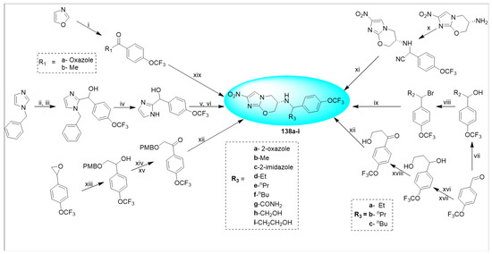 - Sharma, S.; Anand, R.; Cham, P.S.; Raina, S.; Vishwakarma, R.A.; Singh, P.P. A concise and sequential synthesis of the nitroimidazooxazole based drug, Delamanid and related compounds. RSC Adv. 2020, 10, 17085–17093. [Google Scholar] [CrossRef]