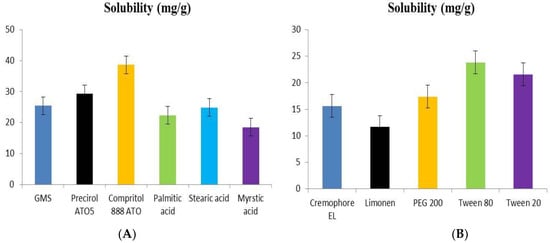 The screening of surfactants was done based on dapagliflozin solubility. The solubility profile of dapagliflozin in different surfactants is shown in Figure 1B. The order of solubility of dapagliflozin in surfactant is Tween 80 ≥ Tween 20 ≥ PEG200 ≥ Cremophore EL ≥ Limonene. Tween 80 was selected for the formulation of dapagliflozin-SLNs as the drug exhibited the highest solubility in Tween 80 [26].