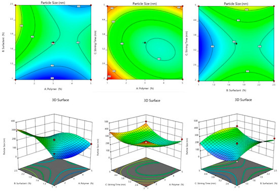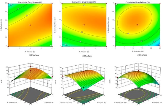 Many researchers have reported using various statistical designs (central composite design (CCD), Box–Behnken design (BBD), D-optimal, Taguchi, 2-level factorial, Placket Burman) for formulation optimization [20,21,22,23], as it reduces the number of trials and saves time. BBD design is an innovative method for formulation optimization. The response surfaces methodology aims to understand the influence of fundamental elements on the response and attain optimal formulations that produce the desired results [24].