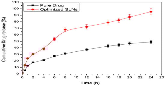 At 24 h, there was an inverse link between surfactant concentration and %CDR. The decrease in drug release could be caused by an increase in lipid concentration, which causes nanoparticles to grow in size, reducing the effective surface area available to interact with the release medium. Furthermore, as the size of the nanoparticles grows, the length of the drug’s diffusion from organic to the aqueous phase grows, lowering drug release. The capacity of surfactant to reduce particle size and enhance surface area and drug release could explain an enhancement in drug release with growing lipid content [29].