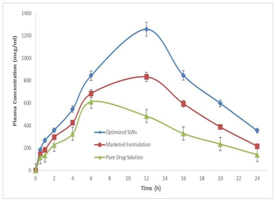 Table 4. Pharmacokinetic parameters of optimized SLNs compared with the marketed and pure drug solution.
