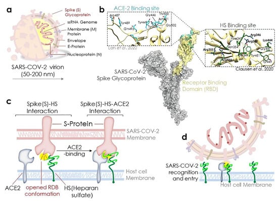 (a–d) Heparan sulfate plays an important role in the binding of the SARS-CoV-2 spike protein (S-protein) to ACE2 and related viral infections. Reprinted with permission from Ref. [34]. ©2021, Rajkumar Sigh Kalra et al., (CC BY 4.0) (for a detailed interpretation of Figure 1, the reader is referred to [34,36]).