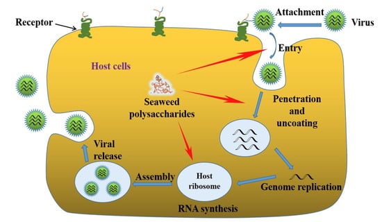 Viral infection and the antiviral phase of seaweed polysaccharides. Reused with permission, license number: 5265040871103 Adapted with permission from Ref. [140]. ©2017, Elsevier Ltd. All rights reserved.