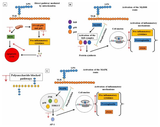 Major inflammatory pathways mediated by the immune system and polysaccharide signaling mechanisms that may contribute to immunosuppressive pro-inflammatory production pathways. (A) Direct route mediated by mitochondria; (B) MyD88 protein signaling pathway; (C) MAPK protein signaling pathway. Reprinted with permission from Ref. [145]. ©2021, Elsevier Ltd. All rights reserved. (for a detailed interpretation of Figure 3, the reader is referred to [145,146]).