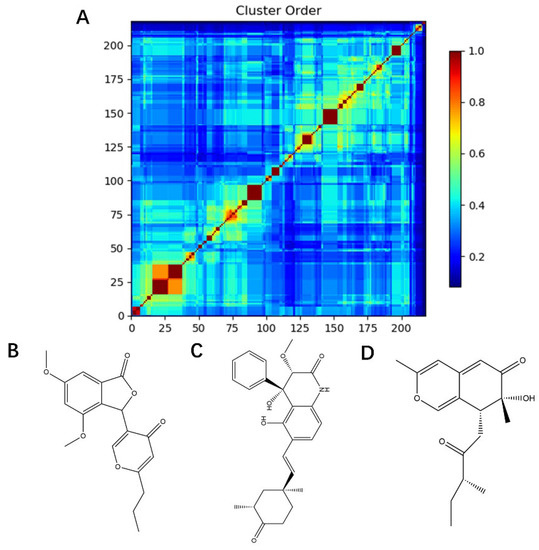 Clustering and typical frameworks of clusters in mangrove secondary metabolite library. (A) Clustering of clusters in the mangrove secondary metabolite library; (B–D) typical frameworks in the candidate compound library.