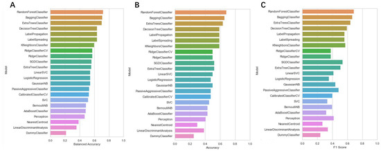 The accuracy of each machine learning algorithm trained using the lazypredict package. (A) Balanced Accuracy value of each machine learning classifier; (B) Accuracy value of each machine learning classifier; (C) F1 score value of each machine learning classifier.