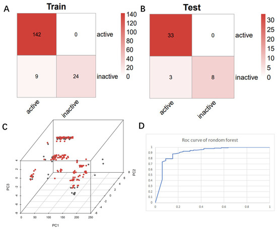 Chaos matrix and roc curve of the constructed random forest classifier and the chemical space of the candidate mangrove compound library. (A) Confusion matrix of random forest classifier to distinguish the training set; (B) confusion matrix of random forest classifier to distinguish the test set; (C) chemical space of the candidate compound library; (D) ROC curve of the random forest classifier.