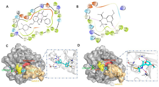 The most pharmaceutically available compound 44 with compound 14 and the KRASG12C docking structure diagram. (A) Two-dimensional binding mode of compound 44 and protein complex; (B) two-dimensional binding mode of compound 14 and protein complex; (C) three-dimensional binding mode of compound 44 and protein complex; (D) three-dimensional binding modes of compound and protein complexes. The purple sticks are hydrogen bonds and the red sticks are ΠΠ cation interactions.
