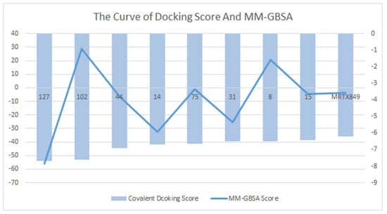 Binding free energies calculated by molecular mechanics generalized born surface area (MM-GBSA) indicate that the compensation between binding enthalpy and entropy plays a crucial role in drug–protein binding. For the alternative lead compound, calculations were also performed in the MM-GBSA module in the Schrödinger Suite 18.4. The values of MM-GBSA for each compound were obtained, and the compound superior to the positive control MRTX849 was selected (Figure 6). We describe the surrounding kinetic environment by analyzing the conformation of protein ligands, but the calculations are too complex to be easily controlled. We selected conformation by analyzing intermolecular MM-GBSA scores and binding fractions, which not only focus on binding but also visualize it by a fraction. The MRTX849 compound has an MM-GBSA score of −3.58, and compound 127 (score = −55.97), compound 44 (score = −6.35), compound 14 (score = −32.68), compound 31 (score = −25.13), and compound 15 (score = −4.43) are higher than the MRTX849, indicating that these compounds may have a better conformation than the positive control.