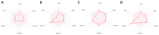 ADME properties of compounds obtained after the covalent screening. (A) ADME properties of compound 14; (B) ADME properties of compound 31; (C) ADME properties of compound 44; (D) ADME properties of compound 127.