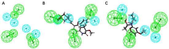 The pharmacophore model was generated based on the common features of the positive compounds and the matching status of the two candidate molecules with the model. (A) The common feature pharmacophore model; (B) the matching status of compound 44 and the model; (C) the matching status of compound 14 with the model.
