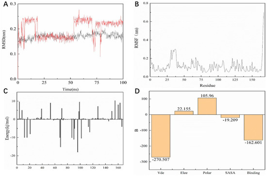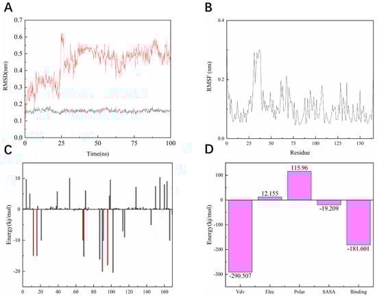 Dynamic simulation results. (A) RMSD values extracted from protein fit ligand of the protein-ligand docked complexes and ligand. RMSD plot of the KRASG12C complex (red) and ligand 14 (black). (B) The RMSF graph of all complexes along with protein during 100 ns MD simulation. RMSF plot of the KRASG12C complex (black). (C) Residue-wise decomposition of binding free energies obtained from the MM-PBSA analyses. (D) Binding energy of binding for the protein complexed with ligand 14.