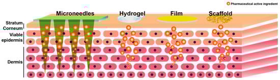 Transdermal drug delivery has many advantages over conventional administration, including avoiding the first-pass effect in the liver, reduced side effects, and improved patient compliance []. However, due to the “brick and mortar” structure of the stratum corneum, drugs cannot effectively cross the skin barrier. To surmount the cutaneous obstacle for more effective topical drug delivery, natural polymeric polysaccharides played an essential role in transdermal delivery as drug or drug delivery carriers and traditional methods such as ultrasound [] and electrical conduction [].
