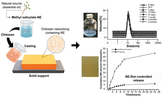 Schematic diagram of the process of nanoemulsions (NE)-film and the size and PDI analysis of formulation for three months after ultrasonication process and the release effect compared with a physical mixture for 24 h []. Reproduced with permission from Talita Nascimento daSilva, International Journal of Biological Macromolecules; published by Elsevier, 2020.
