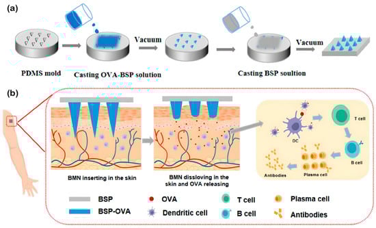 Most herbal medicines have the inherent properties of promoting wound healing, and antiseptic and anti-inflammatory properties. Combined with this feature, MNs based on herbal polysaccharides have been continuously investigated in recent years. In 2018, BSP was used for the first time in the preparation of MNs [], and BSP MN (BMN) containing Rhodamine B (RB) demonstrated good mechanical strength and a desirable cumulative penetration rate. Subsequently, BMN was used to deliver vaccines (Figure 4). The process of preparing MNs has two steps. First, the OVA/BSP solution is poured into the mold and centrifuged to form the MN tip, and then the remaining solution is removed. The BSP solution (15% w/v) was poured, centrifuged, and dried to form the BMN substrate. The BSP in the tip gave the BMN a mechanical strength of 0.63 N/needle and enabled it to penetrate the stratum corneum. The BSP in the substrate relied on its specific anti-inflammatory and antibacterial activity to promote the healing of the microchannels caused by the BMN. BMN was cytocompatible, less irritating to the skin, promoted cell growth to a certain extent, and had good low hygroscopicity. The OVA of 76.74% was released within three hours, and BMN loaded with antigen ovalbumin (OVA) maintained an intact secondary structure within 21 days [].