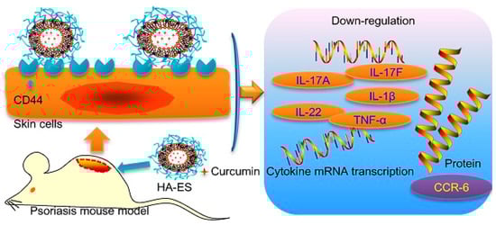 Schematic illustration of the curcumin-loaded HA-ES targeted CD44 protein and reduced the level of TNF-α, IL-17A, IL-17F mRNA, etc., and lowered the expression of CCR-6 protein []. Reproduced with permission from Yongtai Zhang, THERANOSTICS; published by Ivyspring International, 2019.