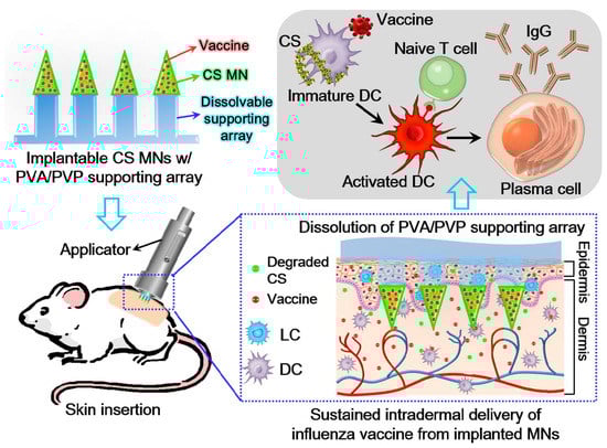 - Chen, Y.-H.; Lai, K.-Y.; Chiu, Y.-H.; Wu, Y.-W.; Shiau, A.-L.; Chen, M.-C. Implantable microneedles with an immune-boosting function for effective intradermal influenza vaccination. Acta Biomater. 2019, 97, 230–238. [Google Scholar] [CrossRef]