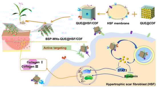 | CD-MOF, QUE, BSP | HSF membrane | Hypertrophic Scars | The combination of bio nanoparticles and soluble MNs inhibited collagens I and III expressions | [] |