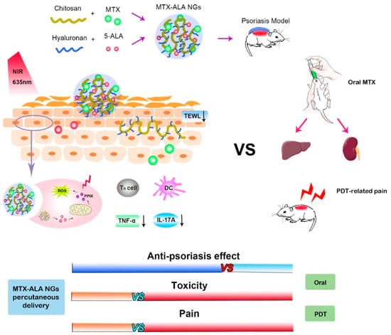 - Wang, Y.X.; Fu, S.J.; Lu, Y.; Lai, R.R.; Liu, Z.Y.; Luo, W.X.; Xu, Y.H. Chitosan/hyaluronan nanogels co-delivering methotrexate and 5-aminole-vulinic acid: A combined chemo-photodynamic therapy for psoriasis. Carbohydr. Polym. 2022, 277, 118819. [Google Scholar] [CrossRef]