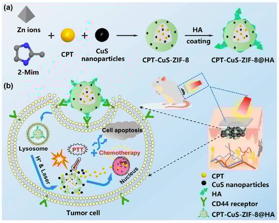 | HA, CuS into ZIF-8 | CPT | Melanoma | Achieve long-lasting enrichment at the tumor site, and the scab disappeared within 7–10 days | [] |