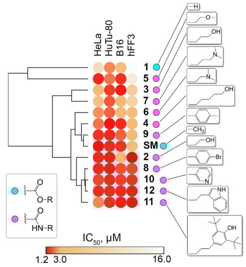 - In the case of hFF3 fibroblasts, compounds 3 and 7 with a C-3 linker between functional groups, both in the series of hydroxyamides (compounds 2–4) and dimethylaminoamides (compounds 6–7), respectively, had a somewhat lower toxicity compared to their C-2/C-5 linker-containing counterparts (IC503 = 6.8 µM versus IC502 = 1.2 µM (C-2 linker) or IC504 = 3.6 µM (C-5 linker); IC507 = 7.7 µM versus IC506= 4.1 µM (C-2 linker)). Additionally, the replacement of hydroxy or dimethylamino groups with a methoxy moiety was desirable for soloxolone amides with a C-2 linker (IC505 = 12.8 µM versus IC502 = 1.2 µM and IC506 = 4.1 µM).