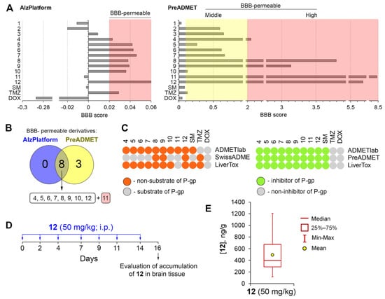 3.2.4. In Silico Prediction of the Blood–Brain Barrier (BBB) Permeability of the Novel Compounds and Their P-glycoprotein (P-gp) Substrate Specificity