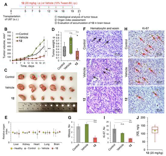 2.2.8. Compound 12 Displayed High Anti-Glioblastoma Potential In Vivo