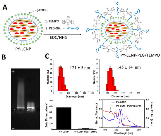 PY-loaded LCNPs (PY-LCNP) were synthesized following the basic procedures described previously [21,22]. The as-synthesized PY-LCNPs display negatively charged carboxylate groups on their surface, providing colloidal stability in aqueous media and presenting a chemical handle for covalent conjugation to amine-containing functional molecules, such as TEMPO. We performed EDC coupling to the PY-LCNPs using a mixed ratio of PEG2000-NH2 (30 mol%, 300 µM) and TEMPO (70 mol%, 700 µM) (Figure 1A) [23]. After conjugation, the particles were purified and characterized by measuring their electrophoretic mobility, size, charge, and spectroscopic properties. The PEG/TEMPO-conjugated PY-LCNP (PY-LCNP-PEG/TEMPO) showed meaningfully different electrophoretic mobility compared to the unconjugated PY-LCNPs, indicating successful conjugation of PEG/TEMPO onto the PY-LCNP surface (Figure 1B). As anticipated, negatively charged, unconjugated PY-LCNP showed clear and robust mobility toward the cathode. However, the PY-LCNP-PEG/TEMPO exhibited minimal migration toward the cathode, confirming the decrease in negative surface charges as a result of the conjugation. These data provided strong evidence for the successful conjugation of PEG/TEMPO onto the PY-LCNP surface. We used dynamic light scattering to estimate the hydrodynamic size and particle concentration of PY-LCNP-PEG/TEMPO. We observed a significant increase (~24 nm) in the average hydrodynamic diameter (Figure 1C) from 121 ± 5 nm (polydispersity index (PDI) = 0.07) for PY-LCNP to 145 ± 14 nm (PDI = 0.19) for PY-LCNP-PEG/TEMPO. The estimated particle concentration for PY-LCNP-PEG/TEMPO was ~53 nM. Zeta potential measurements confirmed the change in overall particle charge from −37 ± 1 mV (PY-LCNP) to −1 ± 0.7 mV (PY-LCNP-PEG/TEMPO) (Figure 1C), which is consistent with the results observed during gel electrophoresis. The conjugation of TEMPO to the PY-LCNP was further characterized and quantified by UV-Vis spectroscopy. The spectra in Figure 1C show distinct differences between the PY-LCNPs and PY-LCNP-PEG/TEMPO in the spectral region from 450 nm and below due to the presence of TEMPO and PEG on the NPs. The extent of conjugation of TEMPO onto the PY-LCNP surface was determined spectroscopically using the TEMPO absorbance maximum at 426 nm (data not shown) and extinction coefficient (17.34 M−1 cm−1) [27]. TEMPO absorbance on the LCNP was deconvoluted by subtracting the absorbance of the LCNP. The calculated concentration of TEMPO on the PY-LCNP-PEG/TEMPO was determined to be ~100 µM in a solution that was 53 nM in NP concentration, indicating ~1880 TEMPO molecules conjugated to each PY-LCNP. According to the initial reaction conditions in the EDC/NHS reaction, this corresponds to an efficiency of ~14% for the conjugation of TEMPO to the PY-LCNP. Additionally, the fluorescence (FL) emission spectra of PY in the PY-LCNP-PEG/TEMPO was unchanged from that for PY in the unconjugated LCNPs, indicating no change in PY spectral properties as a result of conjugation. Fully characterized particles were stored at 4 °C and used within 3 weeks, with no visually detectable precipitation or aggregation. This is likely attributable to the presence of PEG, which is well known for imparting colloidal and steric stability to NPs, on the surface of the particles.