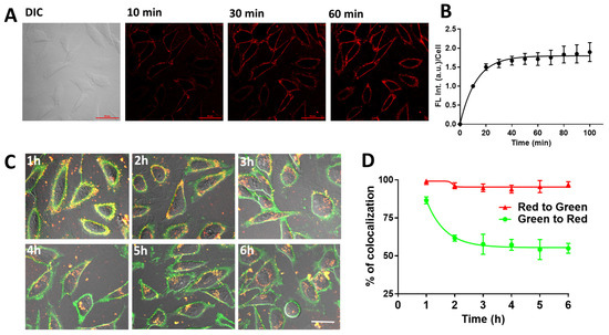 Next, we studied the interaction of the PY-LCNP-PEG/TEMPO with live HeLa cells in a time-dependent manner using confocal microscopy. The PY-LCNP-PEG/TEMPO molecules were incubated with cells at 37 °C for 100 min, and images were acquired every 10 min using the red channel for FL emission signal collection (Figure 2A). Upon 10 min of incubation, PY-LCNP-PEG/TEMPO clearly started accumulating at the plasma membrane, the extent of which increased and became more uniform with increasing incubation time. Quantification of FL emission intensity revealed that the degree of membrane accumulation of the conjugates reached its maximum at ~40 min (Figure 2B), and the staining pattern remained largely uniform, with only a few discrete punctate regions. At the 2 h timepoint, however, it was apparent that the PY-LCNP-PEG/TEMPO began to be internalized by the cells. To determine the rate of PY-LCNP-PEG/TEMPO cellular internalization, we performed time-resolved colocalization studies using an AlexaFluorTM 488 conjugate of the lectin, wheat germ agglutinin (WGA-AF488), which binds to N-acetyl-d-glucosamine and sialic acid moieties on the plasma membrane.