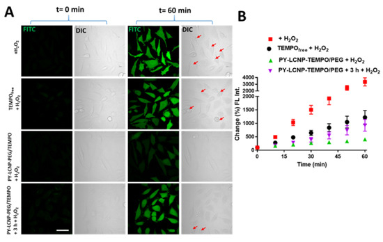 We sought to study the ROS-scavenging and cellular protection activity of the PY-LCNP-PEG/TEMPO in live HeLa cells challenged with two different ROS-generating agents: H2O2 (as an extracellular ROS source) and tBHP (as an intracellular ROS generator). H2O2 is a low-reactive ROS molecule, but it can generate highly reactive forms of ROS, such as hydroxyl radicals (OH•), in cellular environments [28,29]. In contrast, tBHP generates a higher degree of ROS, including H2O2, alkoxyl, and peroxyl radicals, in the cell through metabolism after cellular internalization [30,31]. Both H2O2 and tBHP induce significant oxidative stress to cells through multiple mechanisms, including lipid peroxidation, DNA damage, and depletion of cellular glutathione levels [29]. To perform these experiments, HeLa cells were first incubated with equivalent concentrations of TEMPO (50 µM), present as either TEMPOfree or PY-LCNP-PEG/TEMPO (27 nM of LCNP), followed by exposure to the ROS-generating agents. ROS activity in the cells was imaged and quantified every 10 min for 60 min by confocal microscopy using the fluorescent probe H2DCFDA, which positively tracks the presence of ROS in cells as a function of increasing fluorescence emission. We first tested the ROS-scavenging and cellular protection activity against H2O2 (500 µM) exposure. As shown in Figure 3A, minimal fluorescence emission for H2DCFDA was observed immediately after adding the ROS-generating agent H2O2 (Figure 3A, t = 0). However, after 60 min of H2O2 (500 µM) exposure, the emission intensity for the H2DCFDA showed differential increases in untreated, TEMPOfree, and PY-LCNP-PEG/TEMPO-treated cells. This was also coupled with various levels of membrane blebbing, which is an indication of cellular damage due to ROS activity [32,33]. After 60 min, the intensity of the H2DCFDA in the untreated (control) cells was significantly higher than that of cells treated with PY-LCNP-PEG/TEMPO. Furthermore, there were differences noted in the H2DCFDA signal depending on whether the cells were pretreated with PY-LCNP-PEG/TEMPO for 3 h or immediately prior to H2O2 exposure (Figure 3A). In this instance, treating the cells with PY-LCNP-PEG/TEMPO immediately prior to H2O2 exposure proved to be more effective at reducing overall ROS generation and providing protection against cellular damage. Additionally, the DIC imaging of immediately treated PY-LCNP-PEG/TEMPO cells showed noticeably lower plasma membrane blebbing compared to the untreated or TEMPOfree treated cells. Given our results for the cellular internalization of PY-LCNP-PEG/TEMPO (see Figure 2 above), it is likely that the large degree of cellular uptake of PY-LCNP-PEG/TEMPO over 3 h depletes the local TEMPO concentration present at the plasma membrane, resulting in reduced efficacy in the prevention of H2O2-induced ROS generation. To quantify and compare the ROS activity and rate of ROS neutralization in different samples, we analyzed the cells for the changes in H2DCFDA FL emission intensities every 10 min over 60 min of H2O2 exposure. As shown in Figure 3B, ROS activity in the untreated cells gradually increased with incubation time (500 µM H2O2) and reached an activity level 34-fold above that of the control cells (rate of increase = 52% min−1). In comparison, the ROS activity in the cells treated with TEMPOfree and PY-LCNP-PEG/TEMPO immediately prior to H2O2 treatment increased only 12-fold (rate of increase = 19% min−1) and 4-fold (rate of increase = 4% min−1), respectively. However, the ROS activity of cells treated with PY-LCNP-PEG/TEMPO and incubated for 3 h prior to H2O2 treatment increased 9-fold (rate of increase = 12% min−1), which is more than 2-fold higher and faster than the cells exposed to H2O2 immediately after the PY-LCNP-PEG/TEMPO treatment. These results strongly suggest that, compared with TEMPOfree, PY-LCNP-PEG/TEMPO pre-treatment immediately prior to H2O2 exposure reduced the overall ROS activity by 3-fold and significantly decreased the rate of cellular ROS exposure and increased protection against H2O2-incuded ROS activity. Meanwhile, pre-treatment for 3 h of PY-LCNP-PEG/TEMPO reduced overall ROS activity by ~1.3-fold compared with TEMPOfree. In the context of previous reports, our PY-LCNP-PEG/TEMPO conjugate system is an improvement over other NP-TEMPO systems. For example, Li et al. reported on gold NP (AuNP)-TEMPO conjugates, wherein the ROS scavenging activity of TEMPO was improved by ~1.3-fold when displayed on the surface of 40 nm diameter AuNPs [20]. The enhanced activity we observed in this study is likely due to the greater degree of multivalent display in our PY-LCNP-PEG/TEMPO system (>1800 TEMPO moieties per NP) on the 120 nm diameter LCNPs.