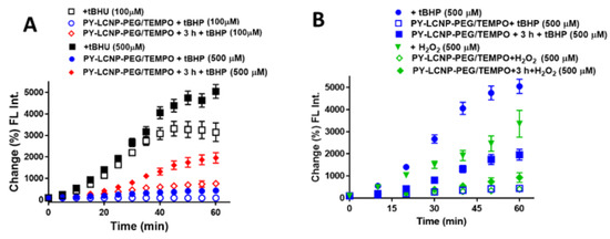 To further characterize the ROS-scavenging and cellular protection capabilities of PY-LCNP-PEG/TEMPO, we tested the conjugate’s ability to protect cells against tBHP, which generates ROS species intracellularly upon its internalization and metabolism [30,31]. The ROS-scavenging activity of PY-LCNP-PEG/TEMPO (50 µM TEMPO or 27 nM LCNP) was tested against two tBHP concentrations: 100 µM and 500 µM. In this case, we anticipated that internalized PY-LCNP-PEG/TEMPO might show better ROS-scavenging activity against tBHP-induced ROS species compared with membrane-associated PY-LCNP-PEG/TEMPO as TEMPO has previously been shown to have a low capacity for traversing the plasma membrane [14]. As shown in Figure 4A, tBHP generated an increasing concentration of ROS species over time in untreated cells, reaching up to 32-fold (rate of increase = 80% min−1) and 50-fold (rate of increase = 100% min−1) for 100 µM and 500 µM of tBHP, respectively, over 60 min. PY-LCNP-PEG/TEMPO showed robust ROS scavenging capability against tBHP-induced ROS species when tested immediately after incubation. With immediate PY-LCNP-PEG/TEMPO treatment, the ROS activities against 100 µM and 500 µM tBHP were measured to be 3.6-fold (rate of increase = 0.2% min−1) and 11-fold (rate of increase = 6.4% min−1) lower, respectively, compared to untreated cells. However, lower ROS-scavenging ability of PY-LCNP-PEG/TEMPO was measured when cell samples were exposed to tBHP 3 h after labeling with PY-LCNP-PEG/TEMPO, contrary to our initial thoughts. Here, ROS production against 100 µM and 500 µM tBHP was measured to be about 4-fold (rate of increase = 14% min−1) and 3-fold (rate of increase = 31% min−1) lower, respectively, compared to untreated cells. This lower ROS-scavenging ability of PY-LCNP-PEG/TEMPO upon internalization is likely due to limited endocytic escape and the clustering behavior of PY-LCNP-PEG/TEMPO observed inside cells (see Figure 2C). Similar trends were also observed (Figure 4B) when comparing the ROS-scavenging activity of PY-LCNP-PEG/TEMPO against the same concentration of H2O2 and tBHP (500 µM). We observed 8-fold and 11-fold reductions in ROS activity against H2O2 and tBHP-induced ROS activity, respectively, when bound to the plasma membrane. After internalization, PY-LCNP-PEG/TEMPO demonstrated only 4-fold and 3-fold reductions in ROS activity against H2O2 and tBHP-induced ROS activity, respectively.