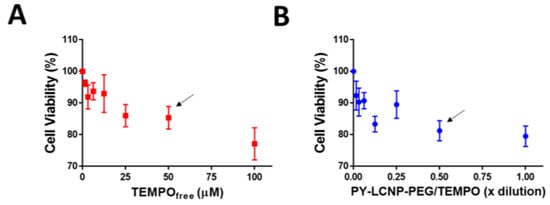 Quantification of cell viability. Indicated concentrations of TEMPOfree (A) and serially diluted PY-LCNP-PEG/TEMPO (B) were used to measure cell variability using MTS assay. The 0.50× diluted PY-LCNP-PEG/TEMPO corresponds to a ~27 nM particle concentration containing 50 µM of conjugated TEMPO. Cells were incubated with TEMPOfree or PY-LCNP-PEG/TEMPO, washed, and cultured in growth medium for 72 h prior to the MTS assay. Average (n = 4 ± SEM) cell viability for different concentrations of TEMPOfree and PY-LCNP-PEG/TEMPO plotted as a percentage of control cells (not treated). Cell viability (>80%) of the comparable concentration (~50 µM) of TEMPO in a free or conjugated form are indicated by the arrows.