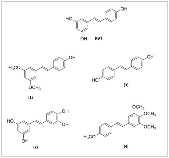 Resveratrol (RVT) and RVT derivatives: (1) Pteorstilbene; (2) Piceatannol; (3) DHS or dihydroxystilbene; (4) DMS 212 or TMS, a tetramethoxystilbene.