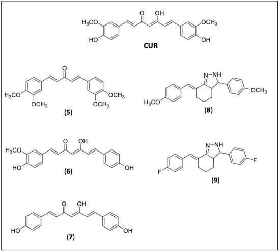 Curcumin (CUR) and CUR derivatives. Natural curcuminoids diveratralacetone (5), demethoxycurcumin or DMC (6), and bis-demethoxycurcumin or BMC (7); synthetic CUR derivative 4a (8), 4e (9).