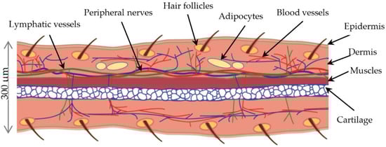 The auricle, also known as the ear pinna, constitutes the external ear together with the ear canal. It is typical of mammals and absent in other vertebrates. The ear pinna collects, amplifies, and directs sounds to the auditory canal; it performs spectral transformations to incoming sounds and enhances sound localisation [1]. In some animals, the functions of ear pinna are heat radiation and mood signalling [2]. The ear pinna is approximately 300 µm thick in adult mice [3]. The appendage has a complex tissue architecture that involves cartilage, skin, vessels, muscles, and nerves. The structure is supported by an internal sheet of elastic cartilage consisting of two layers of chondrocytes approximately 60 µm thick between two thin layers of skin with few hair follicles. The 25–40 µm-thick epithelium is formed by 2–3 layers of keratinocytes, which are covered by a 10 µm-thick stratum corneum. The 25–60 µm-thick dermis comprises a dense extracellular matrix and scarce elongated fibroblasts [4]. The ear pinna is supplied by a complex system of lymphatic [5] and blood vessels and a rich network of peripheral nerves [6]. The striated muscle fibres are situated between the layers of cartilage and the dorsal dermis [5,7]. Figure 1 presents the diagrammatic anatomy of the mouse ear pinna.