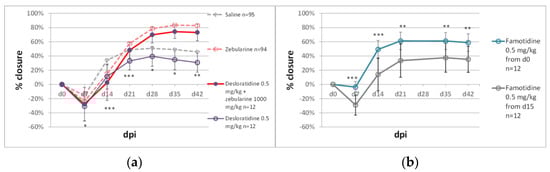 The effect of H1 and H2 blockers, (a) desloratidine and (b) famotidine, on zebularine-mediated ear pinna hole closure. Single, double, and triple asterisks (*, **, ***) denote statistical significance below 0.05, 0.01, and 0.001, respectively. n represents the number of wounds (ears); dpi—days post injury.