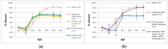 The effect of folates on ear pinna hole closure. (a) Impact of folic acid (FA) and 5-methyltetrahydrofolate (5-MTHF); (b) impact of combinational administration of FA and MTHF on zebularine-induced ear pinna healing. A triple asterisk (***) denotes statistical significance between folates and saline below 0.001. A double hashtag (##) indicates statistical significance between zebularine+folates and folates below 0.01. n represents the number of wounds (ears); dpi—days post injury.