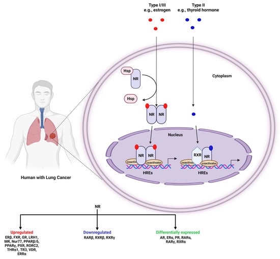 NRs involved in lung tumorigenesis. There are four major types of NRs: Type I/III receptors bind with the ligands in the cytoplasm, leading to their dissociation from the chaperons and subsequent nuclear translocation and transcription of active genes; in contrast, Type II receptors dimerize with the other NRs, and dissociate the corepressor through ligand binding, activating the NRs. Numerous studies have shown differential expression of various NRs in lung cancer.