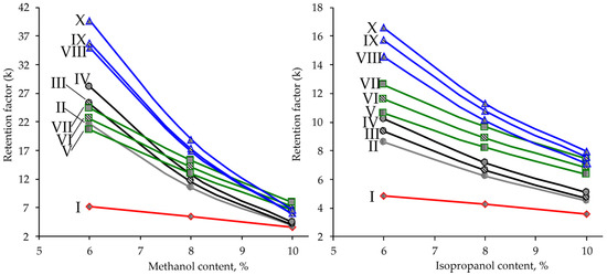 Effect of methanol (left) and isopropanol (right) content in the mobile phase on the retention factors of PCTs on HSS C18 SB stationary phase (flow rate 1.5 mL·min–1, T = 25 °C, backpressure 150 bar).