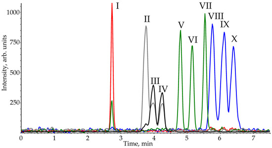 SFC-APCI-MS/MS chromatogram of analytes model mixture (I—200 μg·L–1; II, VIII and X—100 μg·L–1; III, IV and IX—50 μg·L–1; V, VI and VII—25 μg·L–1) obtained on HSS C18 SB stationary phase in the optimized conditions.