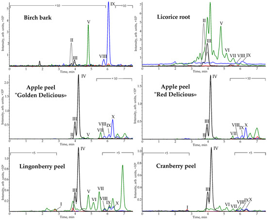 To test the developed method, licorice root, birch bark, and berry and apple peels were selected as real objects. These objects are characterized by a complex chemical composition and are considered an important source of biologically active substances for pharmaceutical, cosmetic and food purposes. PLE with methanol, providing near quantitative extraction of PCTs, was used as a sample preparation method [26]. The resulting chromatograms (Figure 4) demonstrate the presence of all analytes in the samples (Table 3) over a wide range of concentrations (0.0041–250 mg·g−1).