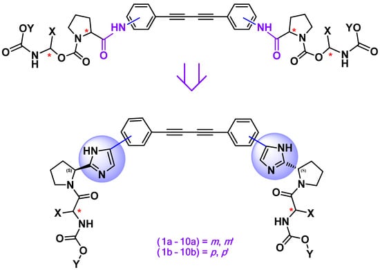 In the pursuit of further developing our previously reported NS5A inhibitors having the 3,3′-(buta-1,3-diyne-1,4-diyl)dianiline and 4-[4-(4-aminophenyl)buta-1,3-diyn-1-yl]aniline cores as a starting point [28], amide groups adjacent to the linker were replaced with imidazole rings, as shown in Figure 1. In some cases of already existing drugs, the change of amide to imidazole also enhanced oral bioavailability, therapeutic window, or even enabled the preparation of injectable aqueous-soluble salts because of the imidazole nitrogen basicity [29].