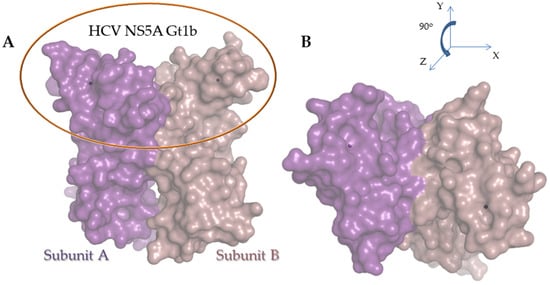 NS5A dimer protein surface representation: (A) AB dimer is shown as a surface with subunit A colored purple, subunit B colored lilac and an orange ellipse highlighting the interface forming between the two, (B) 90° protein rotation of the AB dimer among the Y and Z axis, revealing the whole interface of the N-terminus.
