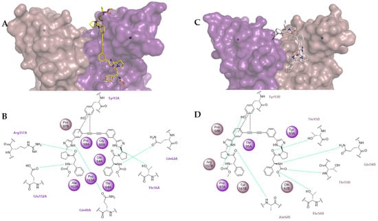 (A) Purple and violet surface representation of the HCV GT 1b subunits A and B, respectively, in the presence of 10a at binding mode obtained from OpenEye the software as yellow sticks and zinc metal shown as faded balls, (B) 2D representation of 10a binding network as obtained from OpenEye software. Residues of purple and violet colors are for subunits A and B, respectively. Green dashed lines represent HB between protein and 10a, whilst black dashed lines refer to π-π interactions. (C) Purple and violet surface representation of the HCV GT 1b subunits A and B, respectively, bound to 10a; pose predicted by the software PyRx as gray sticks and zinc metal shown as faded balls; (D) 2D representation of 10a; binding network predicted by PyRx software. Residues of purple and violet color are for subunits A & B, respectively. Green dashed lines represent HB between protein and 10a, while black dashed lines refer to π-π interactions.