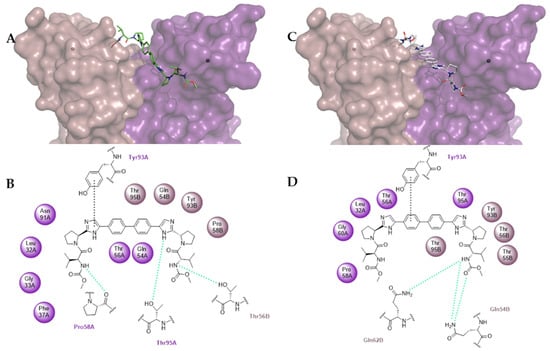 Importantly, as mentioned in the present study and our previous results [27] highly active NS5A inhibitors tend to occupy the centered interface (Figure 5) between the two Tyr93 A/B residues, while solutions traversing down the rifts in either side “due to the protein’s antiparallel symmetry” match with less active compounds (see Supplementary Materials (Figures S1–S21)). Moreover, based on the docking score comparison (see Supplementary Materials Table S1) between two different software programs used in our study, the models represent an almost 90% probability that most active compounds will likely be included in top spots. Thus, models showcase a desired compatibility between in vitro and in silico results, providing further information on possible NS5A inhibitors mode of activity concerning the previously specified region [27,39] of NS5A genotype 1b. Concluding to somewhat higher confidence for future rational drug design efforts.